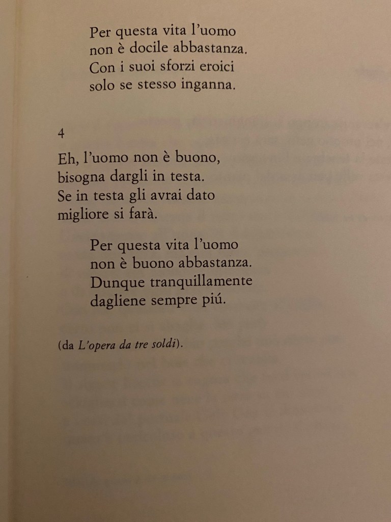 Bertolt Brecht intona con esattezza immaginifica l’insufficienza umana, ne detona le grandezze allo scuotersi di un pidocchio sul capo e se la furbizia non conoscerà mai i raggiri di se stessa, ci sarà sempre qualcuno che “da in testa” e qualcun altro che del suo non essere abbastanza farà un accumulo di botte (e risposte). Tratta da L’opera da tre soldi. Einaudi editore.