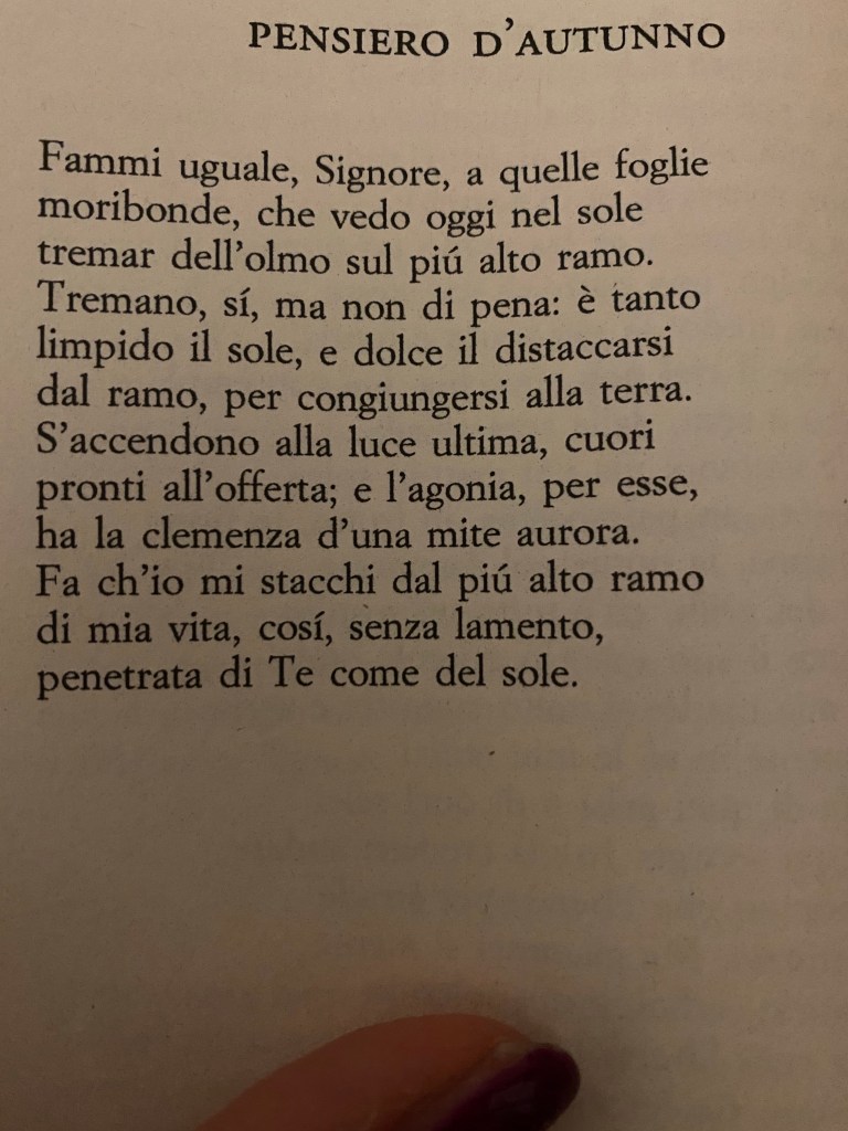 Vespertina di Ada Negri fu accolto con entusiasmo dal regime e da Mussolini stesso che ne riconobbe il merito “di avere toccato le corde più profonde della lirica italiana”. E d’altronde ci troviamo davanti a una poesia estremante musicale e attenta alle parole che diventano suoni e che presagiscono un misticismo intenso, l’abbandono a Dio tipico della italianità più tradizionale in cui la malinconia diventa modello umanistico e strascico di foglie condotte dai (troppi) venti. Forse può stupire che la pena della morte vicina diventi stupore di luce in accurato enjambement che non lasciano prendere fiato tra i versi di endecasillabi. Manca spesso il fiato, lettore o scrittore che sia, a chi domanda la sua salvezza solo al di sopra di sé. Marsilio Editore