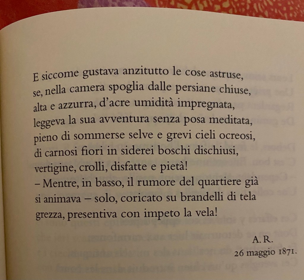 Rimbaud giovanissimo scrive dell’esser poeta a sette anni, dell’austerità delle madri scritturate ai libri del dovere, di sciami di altri bimbi vagamente familiari e così tanto estranei, della Bibbia da leggere e del segreto oppresso, dell’amore negato a un Dio che non ama e del sogno in cui dal sacro pube d’infante si prende il volo. La vela si spiega con parole di bambino (poeta).