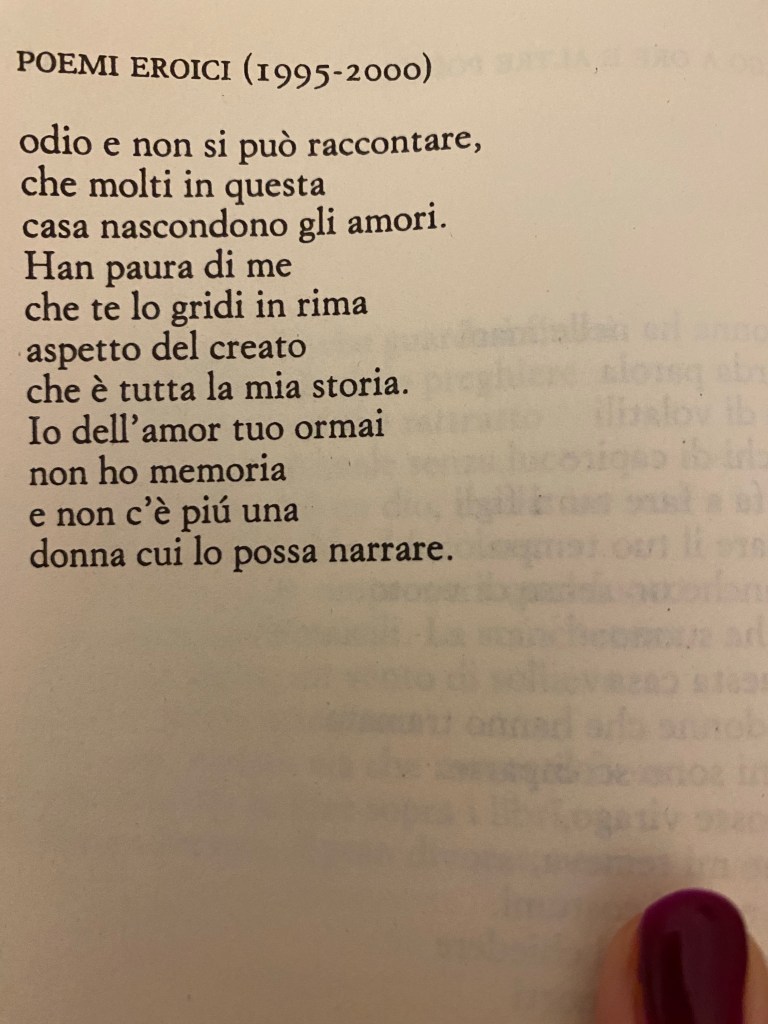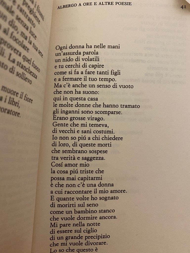 La poesia è un rebus, un tranello, un escamotage per cadere- chiamiamola divertissement e scopriremo come morire ridendo. A volte non si intende se è ortonima o eteronima ma oggi vi dirò che non ha importanza: quando non c’è più una donna a cui poter raccontare l’amore, che sia amante, amica o madre, perfino la memoria diventa un filo di voce. Alda Merini in La clinica dell’abbandono, Einaudi editore.