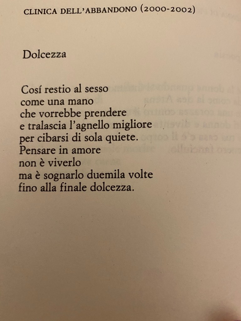 Quasi un testamento d’amore o un testamento di erotismo. Questi versi hanno l’ardire di struggerci e non lo fanno con la ferocia ma con tutta la dolcezza che possiamo vivere. Alda Merini in Clinica dell’abbandono. Einaudi.