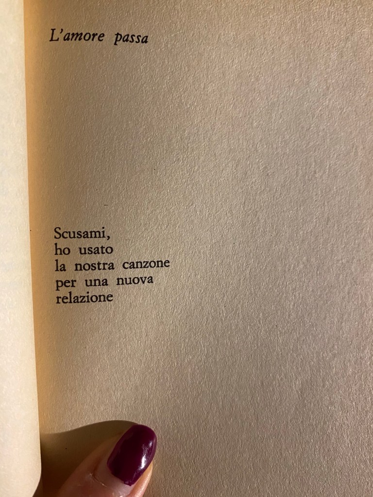 Non so cosa accade a voi, ma io trovo lancinante questo aforisma rimato che non è una poesia, non è un canto, non è un pensiero, non è un’idea. Forse è solo un grido, un grido che arriva dal basso della pagina e si propaga, dilaga. la Feltrinelli