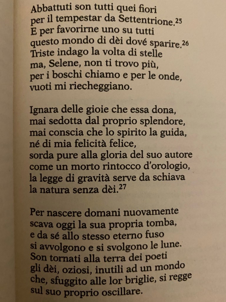 Friedrich Schiller saggista, filosofo, poeta e drammaturgo tedesco della seconda metà del Settecento, pressoché ignorato come poeta in Italia, forse per via del giudizio negativo di Benedetto Croce sul suo approccio alla poesia, filosofico e poco romanticistico (ma qualcosa mi fa pensare che il suo pensiero sulla religione abbia sancito una certa ostilità della critica a lui rivolta -non si smentisce, l’Italia-), delinea un versificare che, con l’uso di metafore e continui rimandi epici, conduce alla comprensione dell’idea che sta alla base della poesia stessa e cioè un attivismo ideologico colto e intellettualistico, perfettamente calato nel clima di ricerca del suo periodo, che non risparmia critiche alla modernità che ha sacrificato il collettivismo del politeismo dell’antica Grecia, ricco di sentimento panico, a un monoteismo soggettivista cupo, impersonale e retto da leggi scientifiche che meccanicizzano la vita e il destino dell’uomo, vittima della scissione dell’io in particelle sub-umane, sub-etiche, sub-divine. la Feltrinelli.
