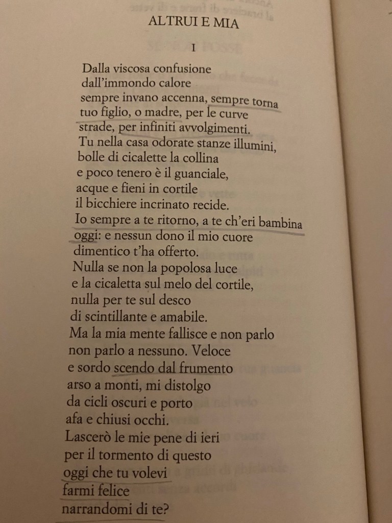 Andrea Zanzotto in Vocativo, “Altrui e mia”, attraverso un contorto e fibrillante flusso psichico torna alla sua origine in una madre bambina. È luglio, le cicale inquietano il primo mattino d’estate, nasce infante una madre ed è già tormento torrido, sete di latte, latte di sete per il figlio che verrà tra le fiamme di una stessa culla che frinisce pathos tra le coperte. Poesia Mondadori