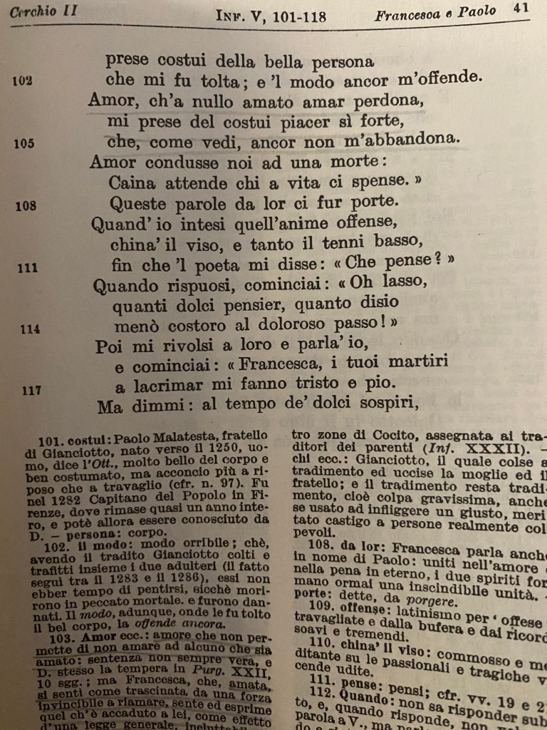 Esiste una legge universale per la quale chi è amato debba, a sua volta, amare necessariamente? L’amore è una forza centripeta biunivoca o può essere anche centrifuga e univoca? E, in ultima analisi, l’amore è espiazione, forza salvifica o ulteriore sensuale condanna? Che ne pensate? Paolo e Francesca, Inferno Canto V. 101-118. Hoepli.