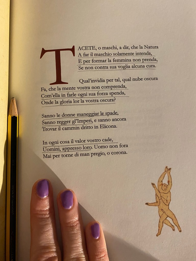 “Tacete, o maschi” è una poesia della poetessa marchigiana Leonora della Genga, esponente di un petrarchismo politico e sociale (e non solo amoroso) e ritenuta inventrice di “sonetti scherzando perpetuamente con due voci” (che non so quanto sia effettivamente un riconoscimento di lode), ci dice, già nel 1300, come le donne, a pieno diritto, potessero fare le stesse cose degli uomini, persino parlare (contravvenendo al silenzio imposto al “gentil sesso”) e scrivere. Donne rivoluzionare si nasce. Argolibri edizioni.