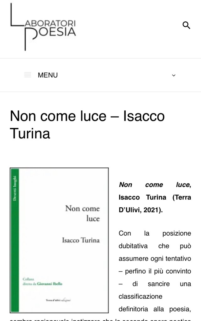 Vi propongo una nota sulla silloge “Non come luce” di Isacco Turina, pubblicata nel 2021 da Terra D’ulivi Edizioni nella collana Deserti Luoghi diretta da Giovanni Ibello.