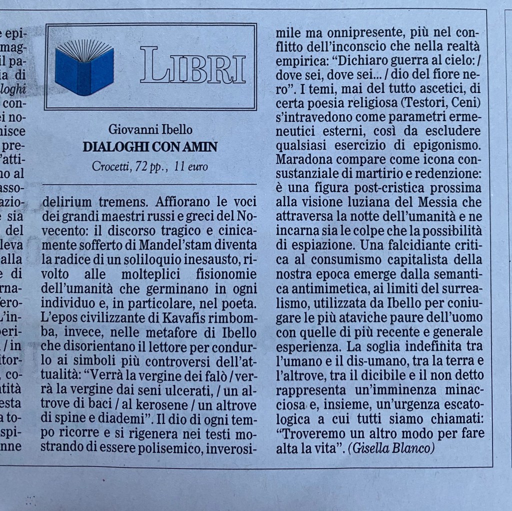 Su Il Foglio di oggi, vi parlo di Giovanni Ibello e dei suoi “Dialoghi con Amin”, uscito a novembre con Poesia Crocetti Editore, con una intensa prefazione di Milo De Angelis.