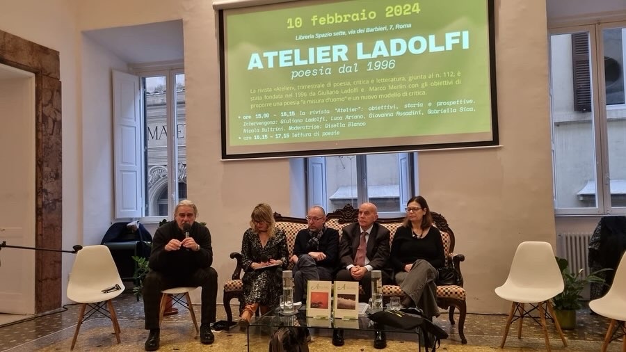 Atelier, Spazio Sette Libreria, gatta Minerva e Giuliano Ladolfi, Giovanna Rosadini Salom, Luca Ariano, Nicola Bultrini, Gabriella Sica.