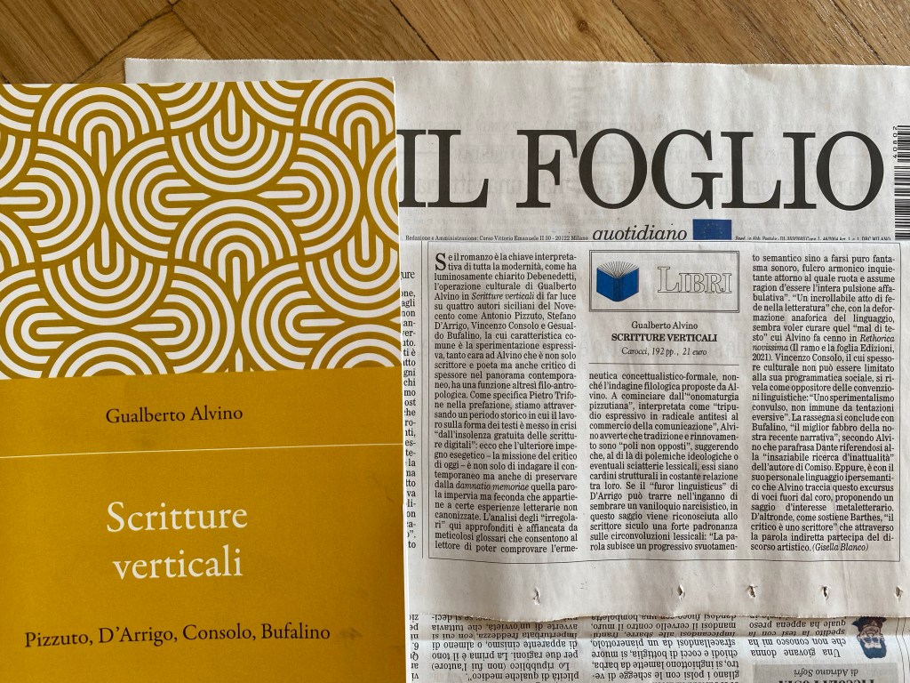 Oggi su Il Foglio vi parlo del saggio “Scritture verticali” di Gualberto Alvino, per Carocci editore, dedicato a quattro “irregolari” della letteratura italiana, fuori dal canone o contro il canone: Pizzuto, D’Arrigo, Consolo, Bufalino.
