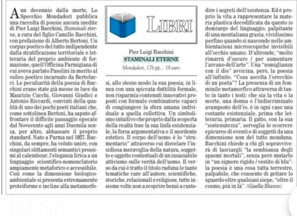 Oggi, su Il Foglio, vi parlo dell’opera postuma di Pier Luigi Bacchini per Poesia Mondadori, curata con attenzione e affetto dal figlio Camillo Bacchini e con una approfondita prefazione di Alberto Bertoni.